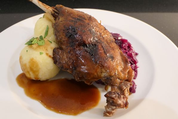 Lassen Sie sich verwöhnen und genießen vom 11. November bis 26. Dezember 2025 die frisch im Ofen zubereiteten ganzen Gänse (für 4 Personen) zusammen mit kräftiger Beifußsauce, Apfelrotkohl, karamellisierten Maronen und hausgemachten Kartoffelknödeln bei uns im Restaurant oder auch zum Mitnehmen.